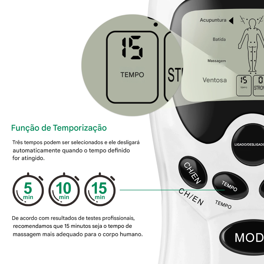 1) Ligue a energia: pressione o botão liga/desliga, a tela LCD exibe a ação da posição de energia, ao mesmo tempo, seta de assinatura disolay LED de seleção para modos terapêuticos, que inclui acupuntura, a força é 0, o tempo é de 15 minutos.