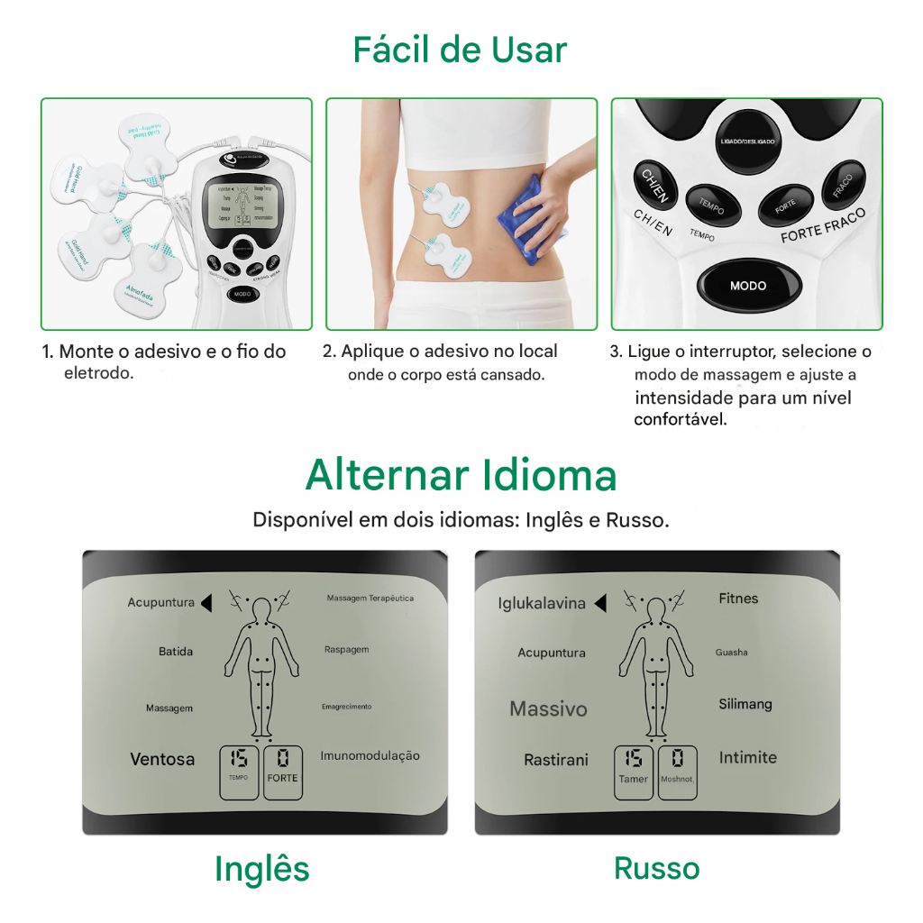 3) O tratamento não pode ser efetuado, a menos que ambos os dois eletrodos estejam colocados na superfície do corpo, não é necessário colocar os dois eletrodos simetricamente